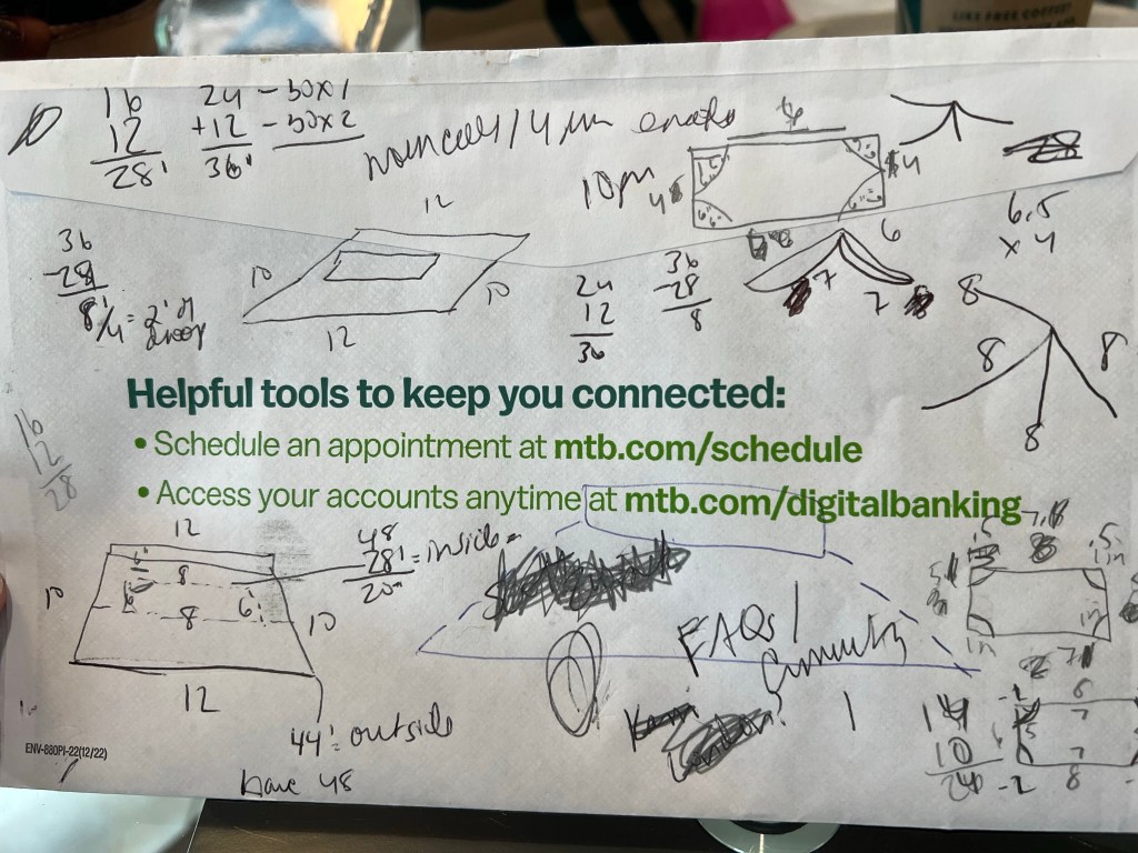 Some of my favorite highlights here are the bed and the window representation. I also like the notation of the “outliers” which clearly shows the serious statistical analysis at play. Unfortunately, I think what puts me firmly in the “non math person” camp is that it took at least 6 hours spread amongst 5 days to figure this out, amid much eye rolling from my kids. I tried to showcase that this was “math in action.” I told them that they should take note for the future, but for some reason they didn’t see the glory in it.
