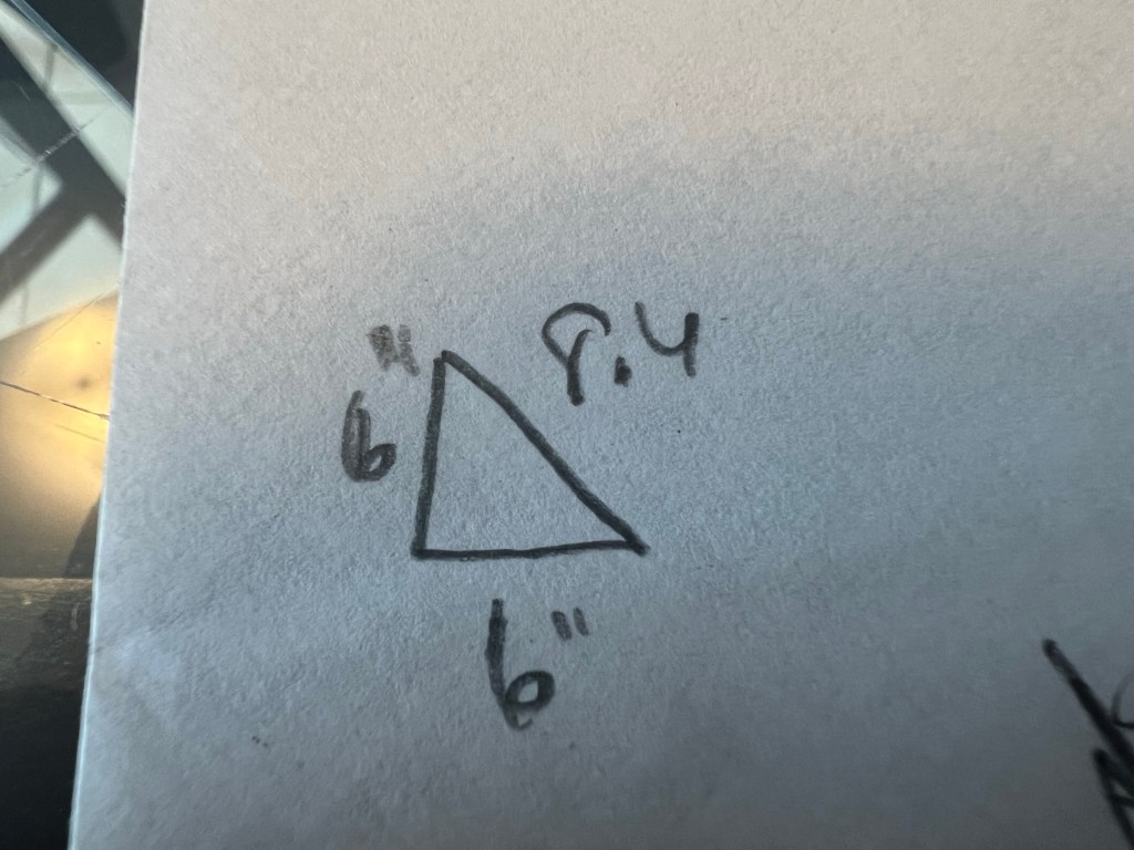 I’d like to draw attention to some highlights once again. To the left of the upper right hand corner, you’ll see a rectangle with curtain like adornments. Those were obviously worthly of further examination and became the zoom in figure below. It was crucial to find the hypotenuese of the right angle at play. I didn’t remember how to do it, but I rememered it was a thing and there are plenty of math formulas out there to help.