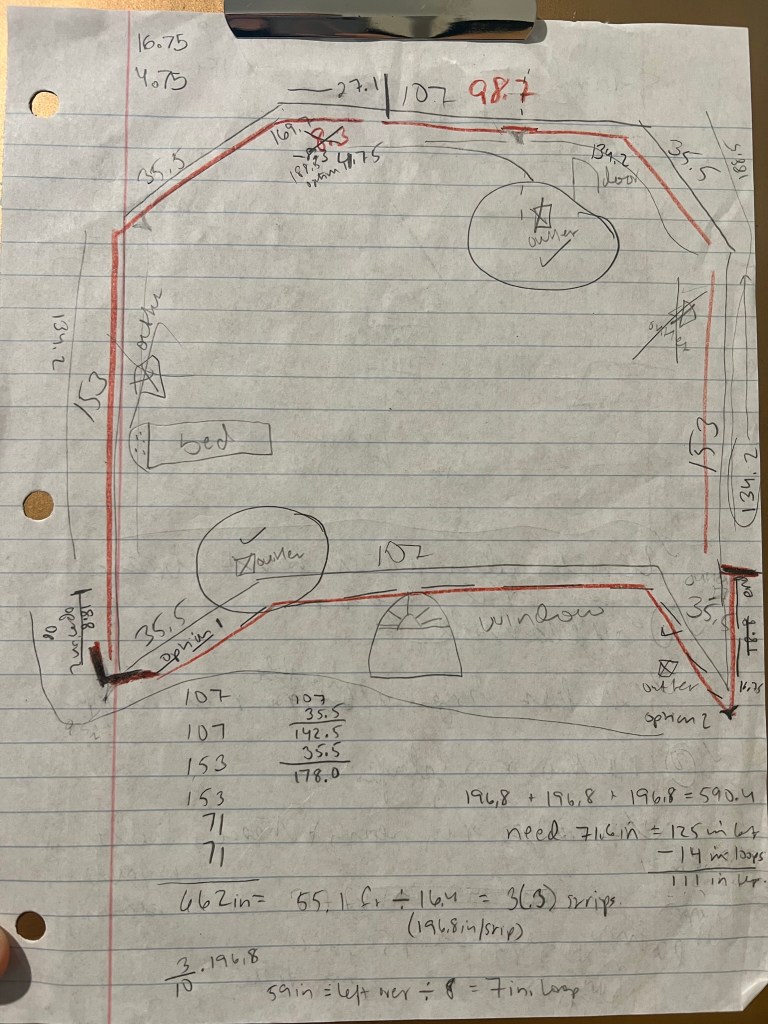 The real opportunity to showcase my skills was when my kids wanted LED lights in their bedrooms. I bought the cadillac brand with tons of app functionality, but the trick was you couldn’t cut them to size. How exciting! A constraint to get around! You had to find a pattern that could work with the layout of the room; no shortcuts allowed. An engineer I would become! The below image illustrates what I like to call “the schematic”.